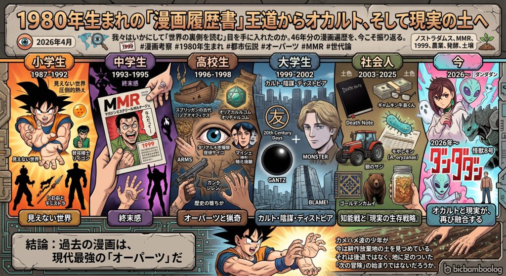 #漫画考察 #1980年生まれ #都市伝説 #オーパーツ #MMR #世代論 ノストラダムスの大予言を信じ、MMRで「マジか!」と叫び、1999年をなんとか生き延びた。そして今、四十代半ばになった我々は、AI、ホルムズ海峡、お金、働き方、農業、土壌の話に目を輝かせている。 ——いったい何があったんだ。これは、1980年生まれというひとつの世代が摂取してきた漫画の記録であり、それがどのように「世界の見方」を作り上げたかの検証でもある。 本記事を読み込んでもらって、AIに画像を生成してもらったが、60%は合っ ...